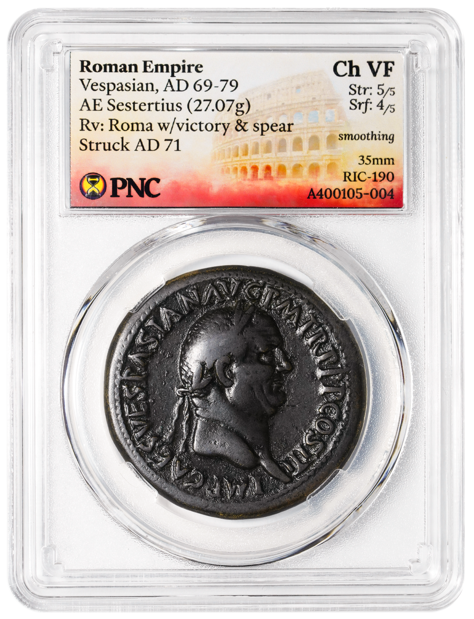 Our signature Roman-themed labeled featuring a view of the colosseum and a bold, glorious red, white and gold gradient background.